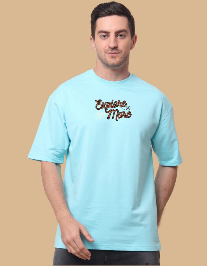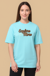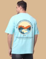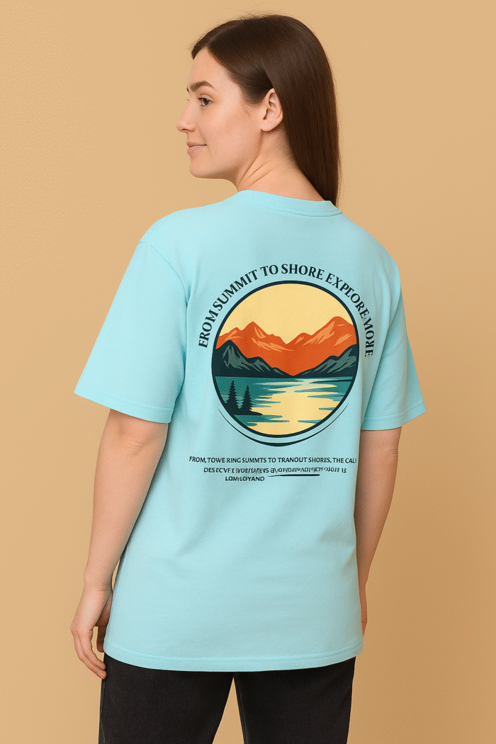 Elevate your casual wardrobe with this stylish Explore More graphic t-shirt in a refreshing aqua blue shade. Made from soft, breathable cotton, this relaxed-fit tee features a minimal front print that reads “Explore More” with playful travel-themed graphics. The back design is a bold, circular mountain-and-lake illustration accompanied by the phrase “From Summit to Shore Explore More” and an inspiring paragraph that captures the spirit of adventure: