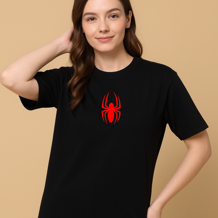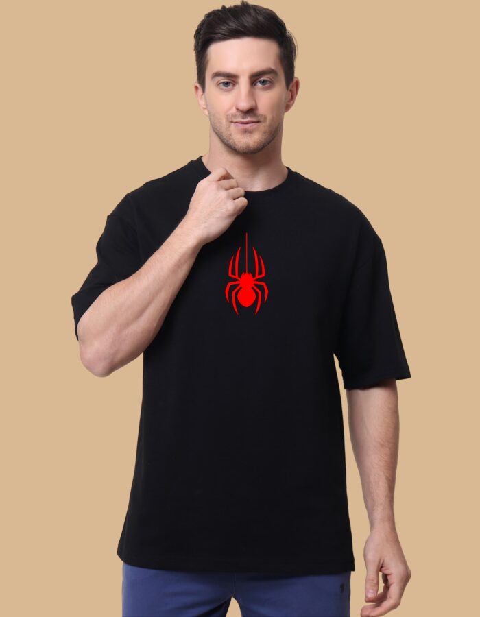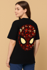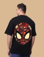 Step into the Spider-Verse with this Multiverse Spider Mask Graphic Oversized T-Shirt. Featuring a bold red spider logo on the front and a detailed back graphic that forms the iconic Spider-Man mask using stylized faces of various Spider-Verse characters, this black tee is a must-have for Marvel fans. The oversized fit and premium cotton fabric make it as comfortable as it is striking — perfect for casual wear or comic con vibes.